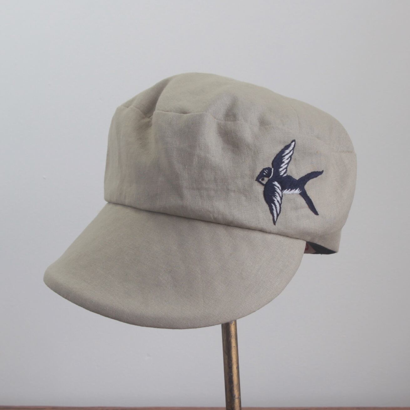 大きなブリムの定番キャスケット/生成りにツバメ刺繍(3色)