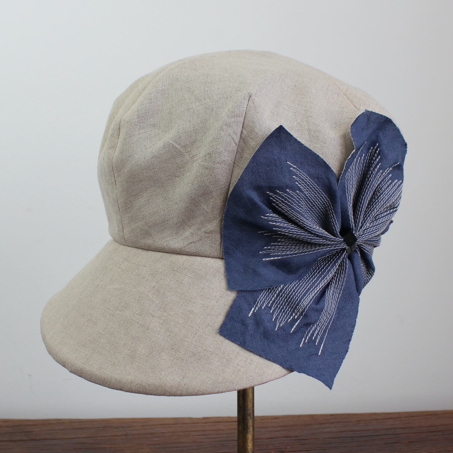 生成りに爽やかのブルーのステッチリボンキャスケットです。