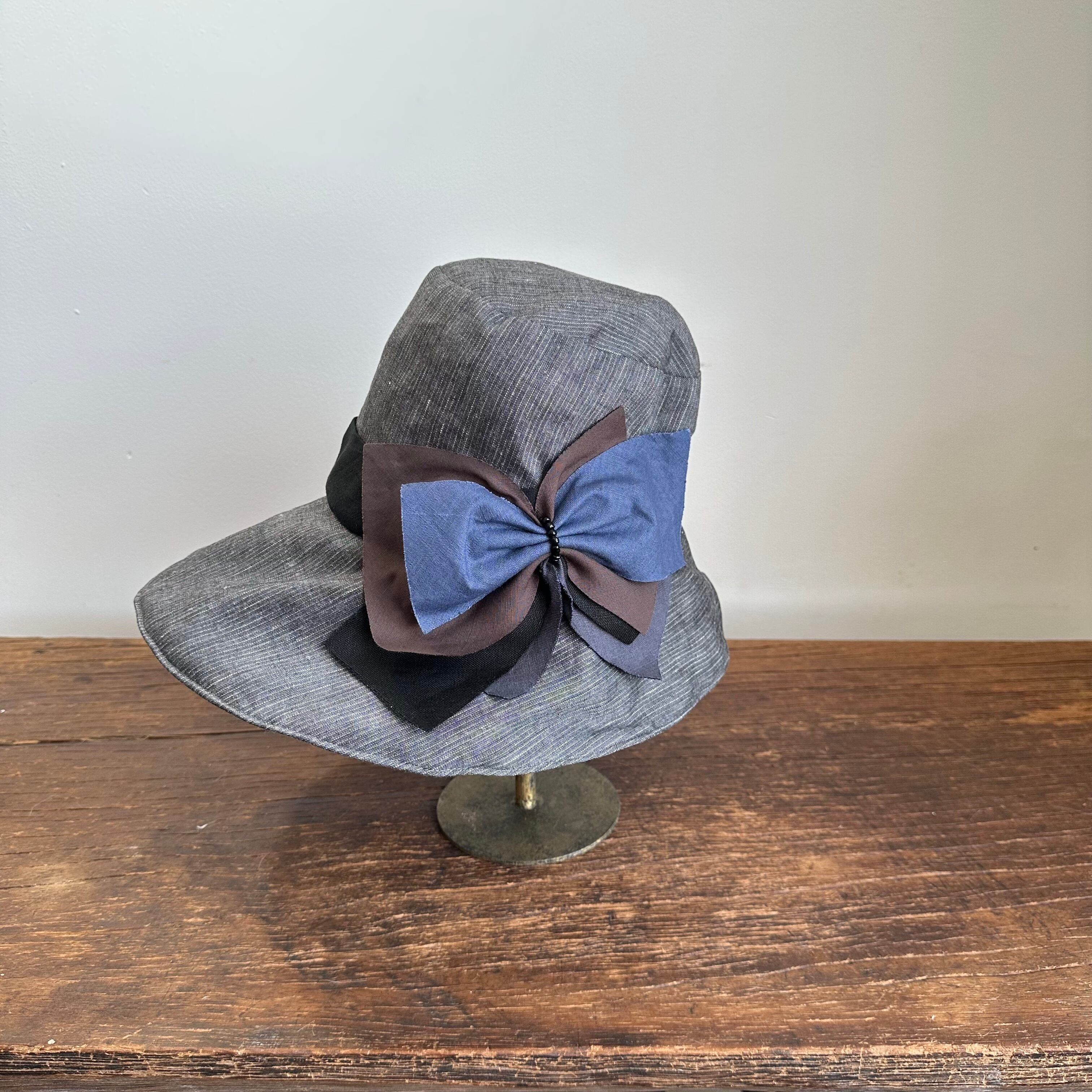 大きな前ブリムのキャペリーヌ/ 4枚リボン(ベルト付き) グレーピンストライプに 4色リボン SS-230