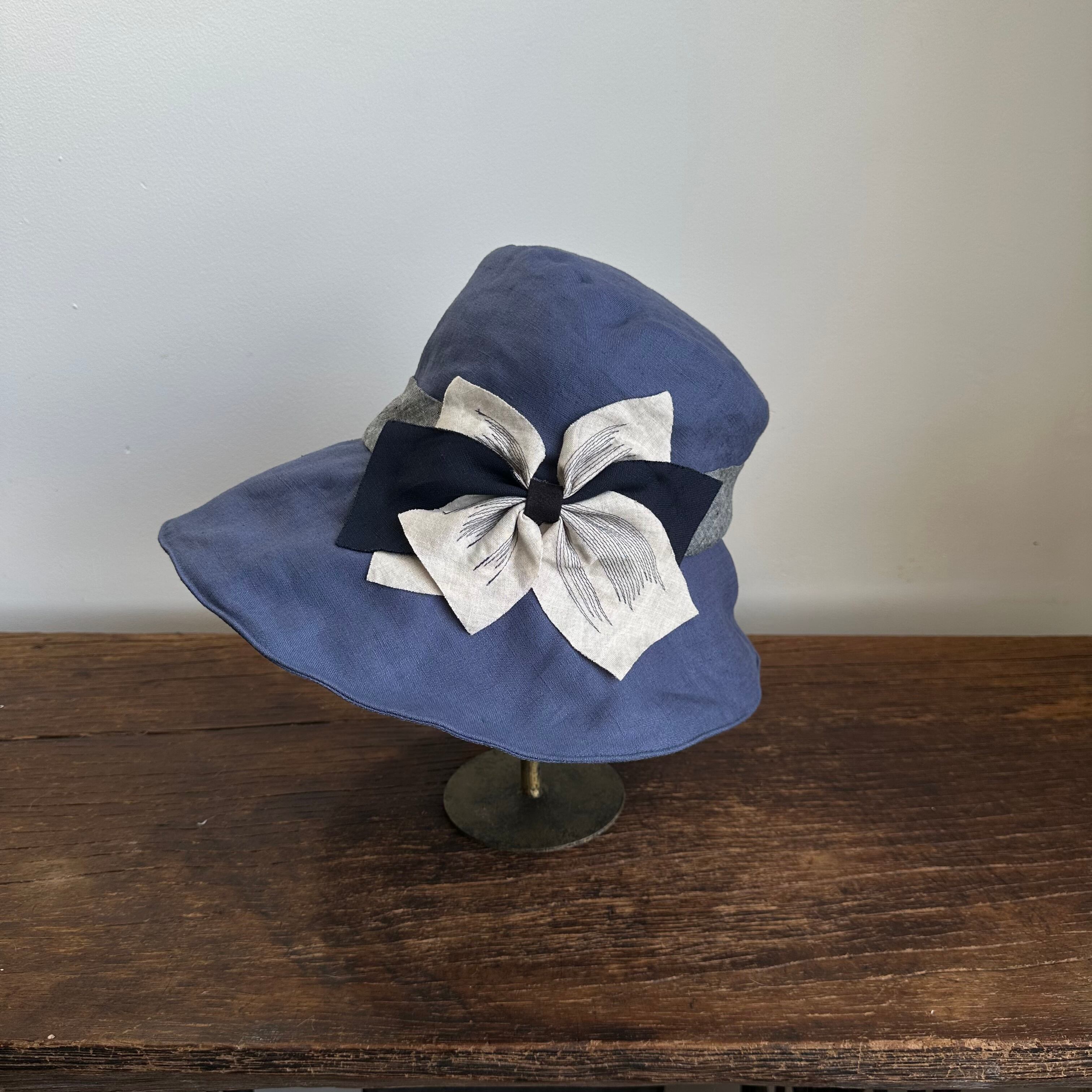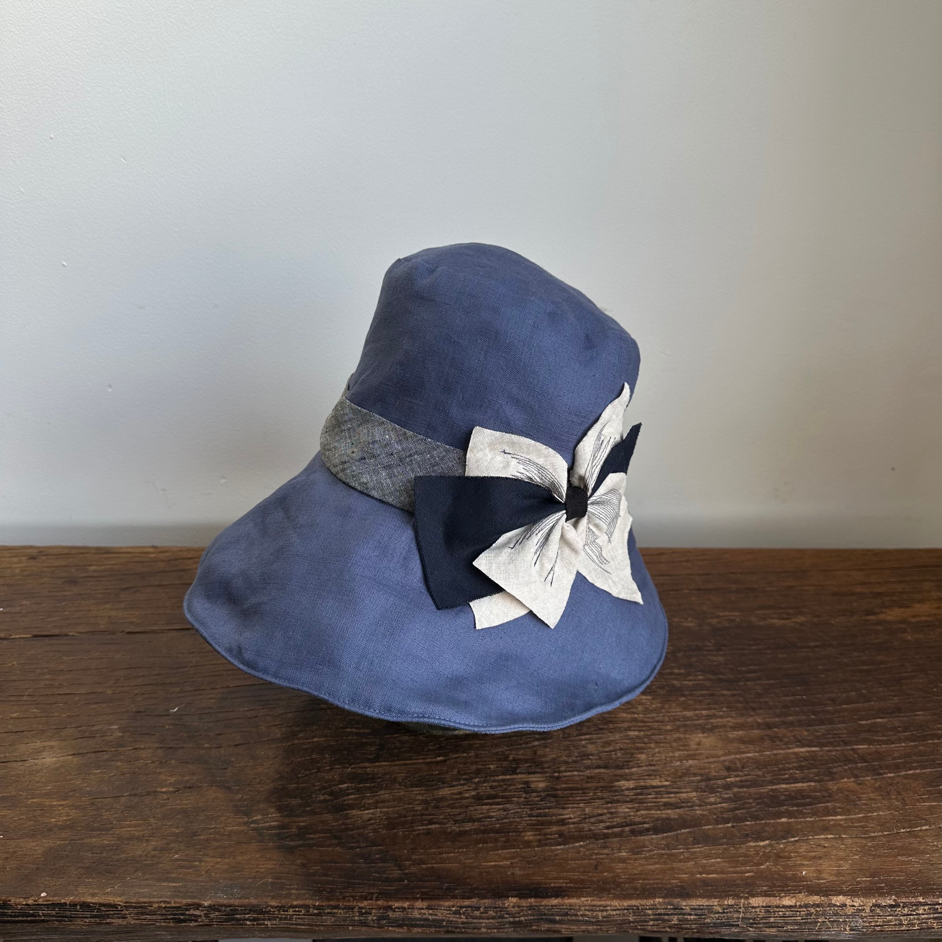 大きな前ブリムのキャペリーヌ/CREAリボン(ベルト付き) ライトネイビーに紺ステッチ生成りリボン SS-235