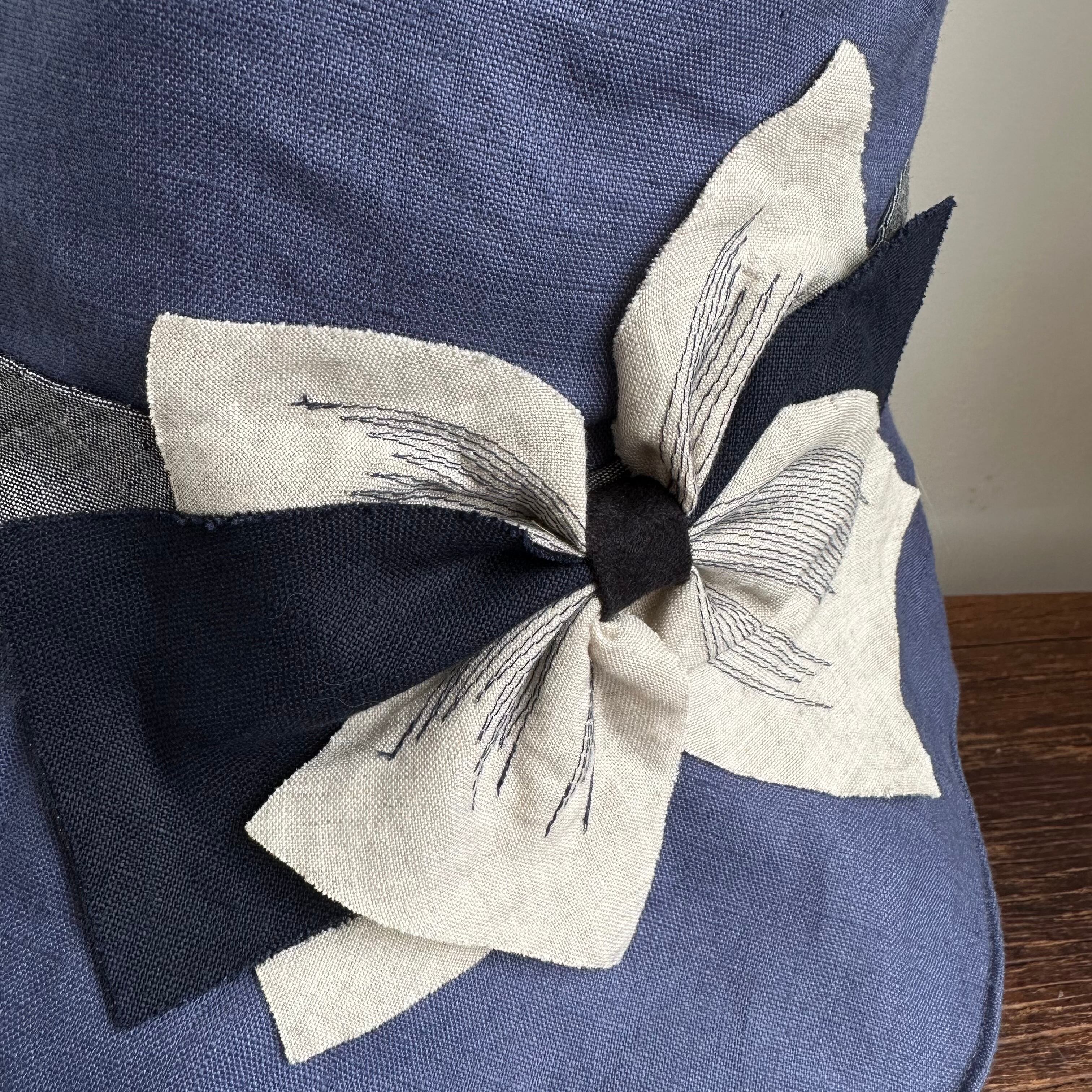 爽やかなイメージのライトネイビーに紺ステッチの生成りリボンも