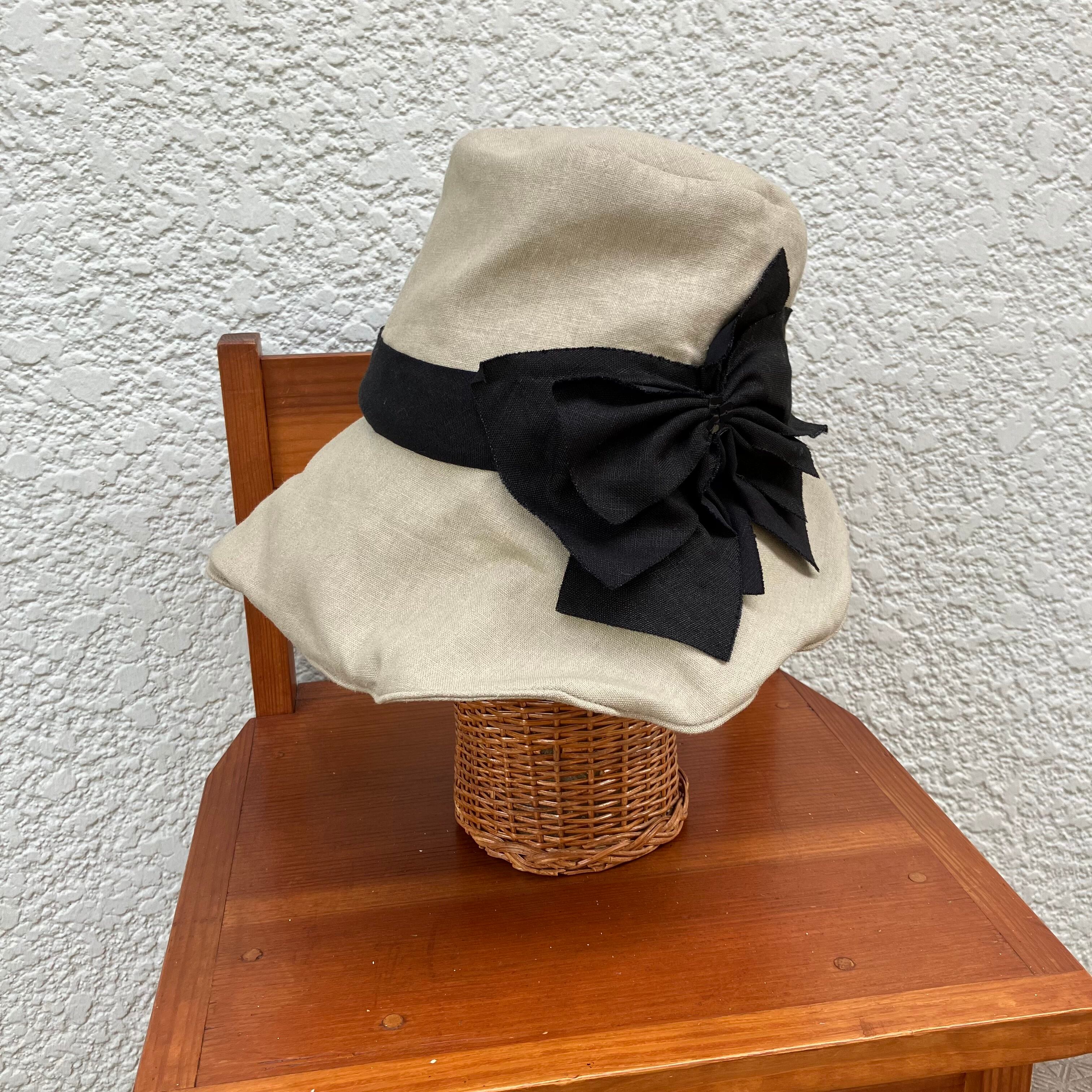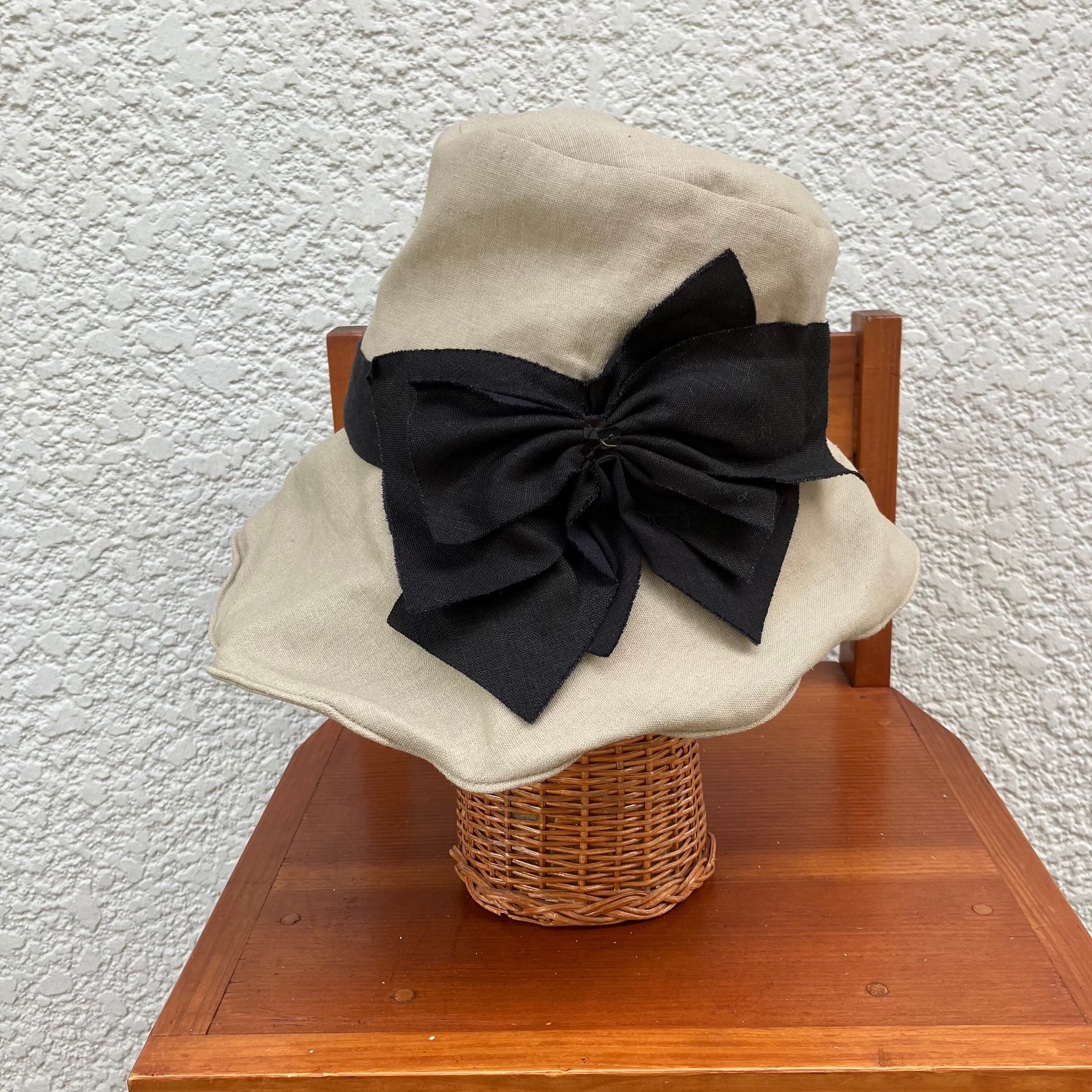 大きな前ブリムのキャペリーヌ/ 4枚リボン カーキベージュにベルト付き黒リボン CF-106